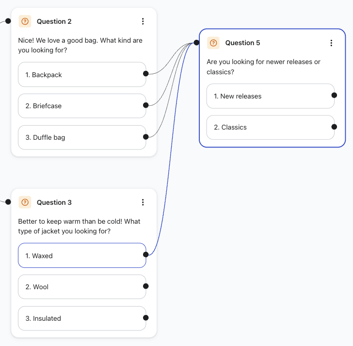 - Por ejemplo, hacer una nueva serie de preguntas o enviar un solo mensaje, si alguien responde con "Bolsos" " Chaquetas" o "Pantalones"