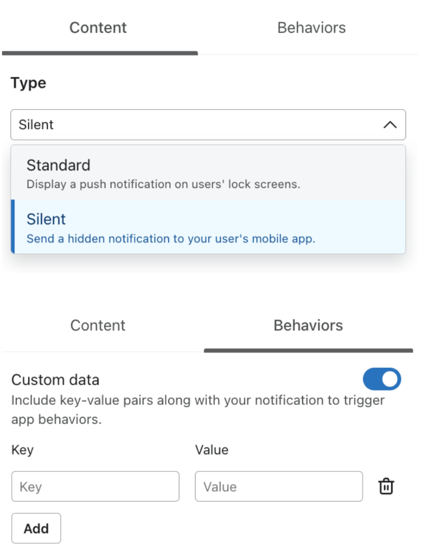 Enviar una notificación push silenciosa implica establecer el tipo de notificación push en Silenciosa y, a continuación, configurar los pares clave-valor (que se encuentran en el ajuste Datos personalizados de la pestaña Comportamientos ).