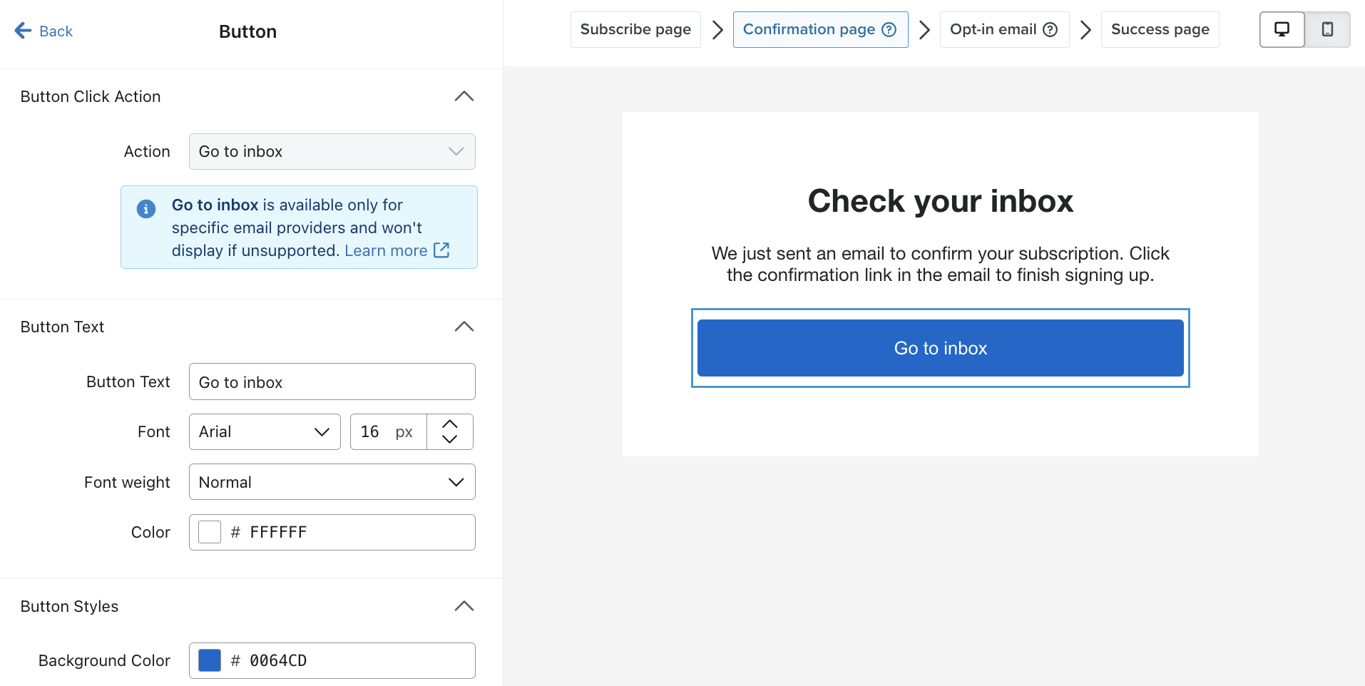 - Ajusta el texto y el estilo del botón según sea necesario; "Ir a la bandeja de entrada" es el texto predeterminado del botón. Se recomienda mantener el texto predeterminado o utilizar algo similar para que el suscriptor sepa qué acción se producirá cuando haga clic en el botón.