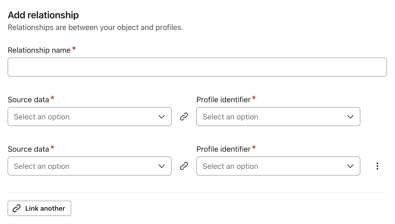 Establece el identificador de perfil (es decir, correo electrónico, número de teléfono, etc.). Esto debe incluirse en la fuente de datos para que un objeto se asocie a un perfil. Usa el botón Vincular otra propiedad para agregar pares adicionales de propiedades e identificadores.