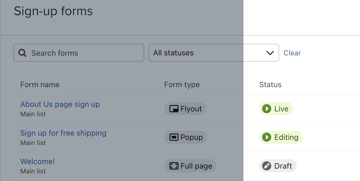 Selecciona la pestaña Formulario de registro en la navegación de la izquierda de Klaviyo para ver una lista de todos los formularios de tu cuenta, y un desglose de sus detalles clave y métrica. Ten en cuenta que sólo verás la página de vista de lista de formularios si has creado al menos 1 formulario de registro.