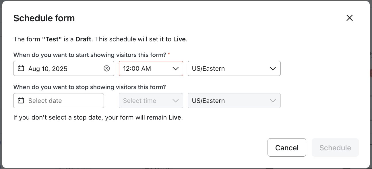 Establece una fecha para que empiece o deje de mostrarse tu formulario en tu sitio.