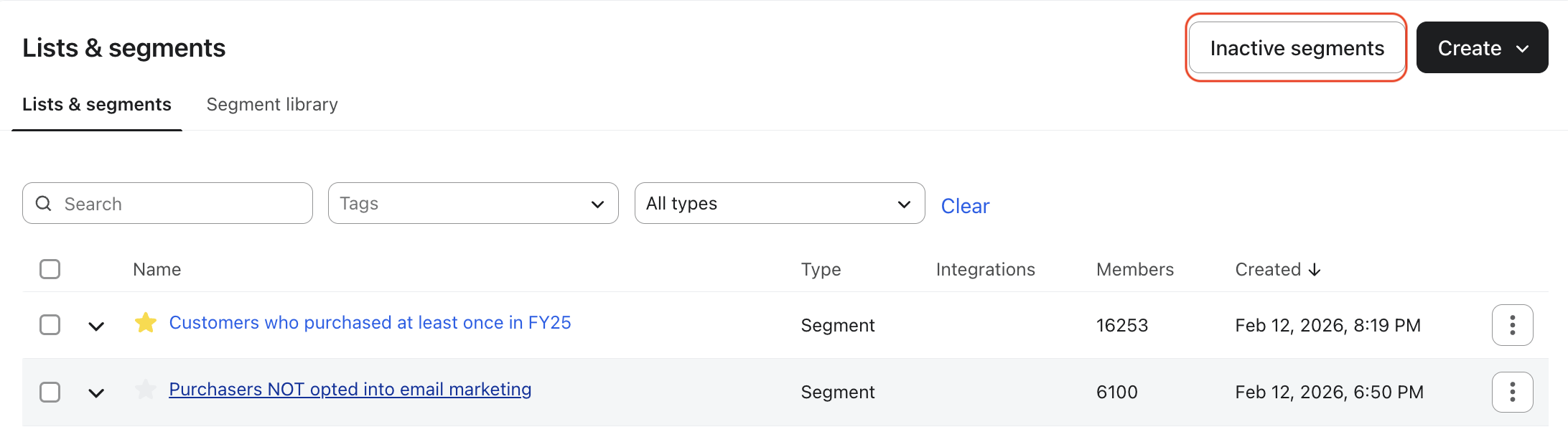 Los segmentos inactivos son aquellos que no has utilizado en los últimos 45 días (en el caso de los segmentos normales) o 365 días (en el caso de los segmentos destacados). Estos segmentos se mueven automáticamente a la sección Segmentos sin actividad de la página Segmentos de tus listas &. Una vez que un segmento se haya marcado como sin actividad, ya no lo verás disponible para campañas, activadores y filtros de flujo, exportación o formulario de registro. Los segmentos inactivos pueden reactivarse en cualquier momento.