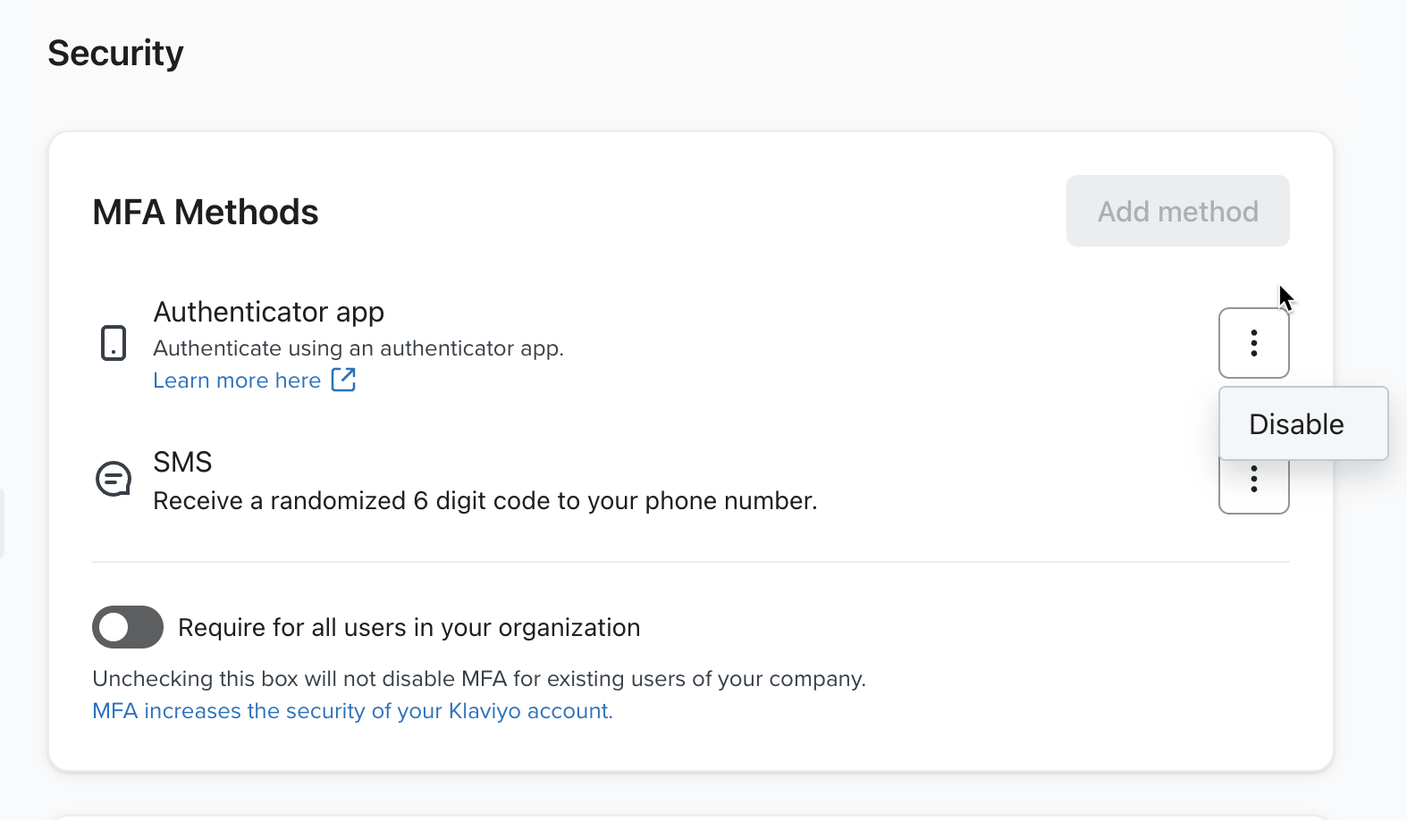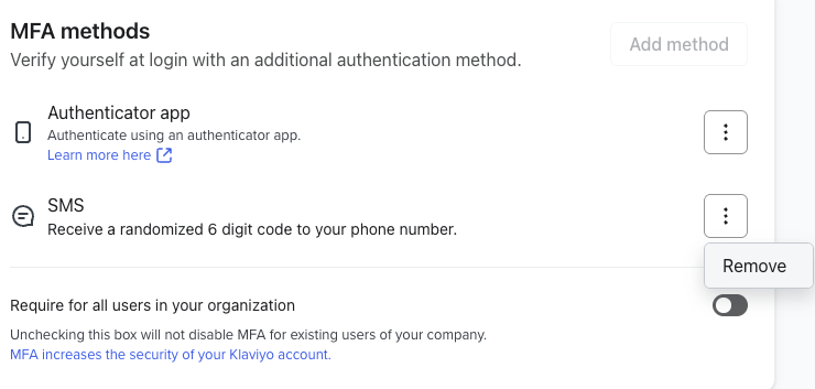 Si configuras ambos métodos de autenticación multifactor, Klaviyo elige por defecto la aplicación de autenticación, ya que es más segura.