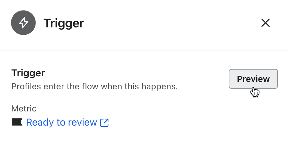 Actualmente, la herramienta de previsualización de la configuración del activador de flujo sólo está disponible para: lista, segmento o flujo activado por métrica. Esta función/característica no está disponible para el flujo de fecha propiedad, inventario bajo o bajada de precio.