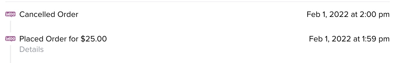 Los eventos se rellenan a lo largo de la línea de tiempo de un cliente cada vez que realiza una determinada acción. Cada evento -como con actividad in situ, Pedido realizado o Pedido cumplido- se conoce como métrica. Puede haber varias instancias de datos métricos para un contacto, siempre que realicen la acción correspondiente más de una vez. Por ejemplo, cuando un cliente realiza varios pedidos en tu sitio web, tendrá varios Pedidos realizados métrica listados en su línea de tiempo. -
