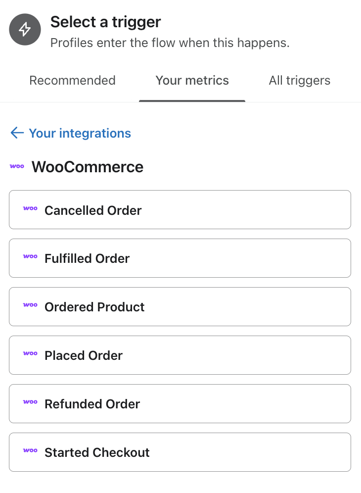 - A continuación, diseña tu flujo. Puedes activar tu flujo basándote en cualquier evento sincronizado desde WooCommerce.