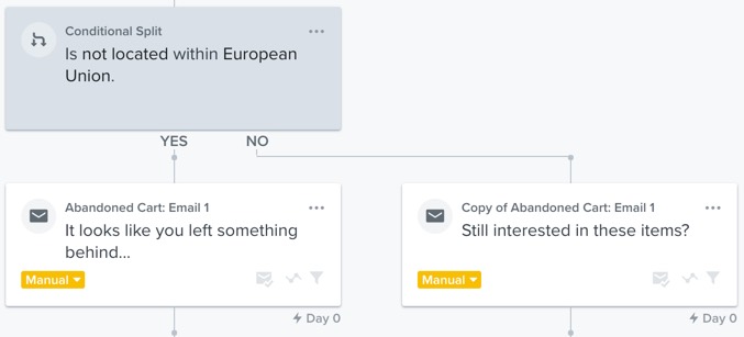 Si, en cambio, quieres que el cliente vea mensajes diferentes, añade una división condicional con la condición de que alguien no esté dentro de la UE.