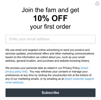 Si utilizas formularios de Klaviyo y tienes suscriptores que se encuentran en lugares más regulados, como la UE o California, tal vez quieras incluir este lenguaje de consentimiento en todos tus formularios. Si tienes sedes separadas para clientes procedentes de distintos lugares, puedes tener dos formularios de registro diferentes. Una con información más específica destinada a cumplir la normativa sobre protección de datos, y otra sin la información adicional para los compradores de otros lugares.