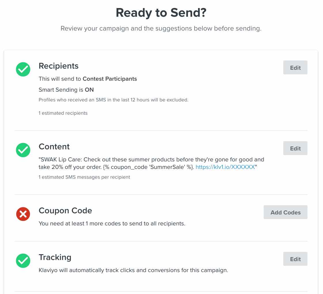 Klaviyo comprobará que el cupón tiene suficientes códigos para los destinatarios, y no podrás enviar hasta que tengas suficientes para todos tus destinatarios. Es una buena práctica añadir más código de cupón del que necesites por si programas la campaña para enviarla más tarde y se unen más personas a la lista o segmento al que estás enviando.