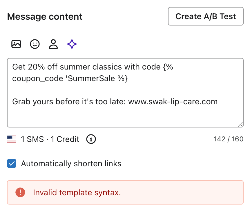Siempre que haya contenido dinámico implicado (como con un cupón único), Klaviyo sólo puede proporcionar una estimación, no una longitud exacta de caracteres, para el SMS.