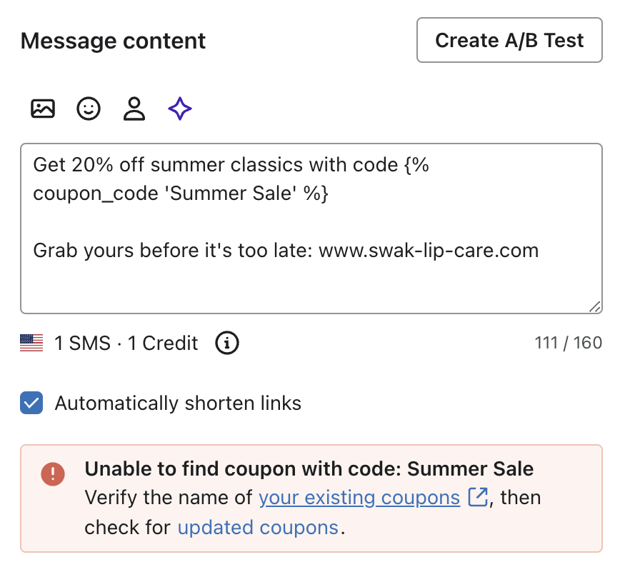 Una vez que tengas cupón generado o subido a Klaviyo, puedes empezar a incluir cupón en SMS o MMS campañas enviadas a tu suscriptor. Sólo se puede añadir 1 código de cupón a un único mensaje SMS.