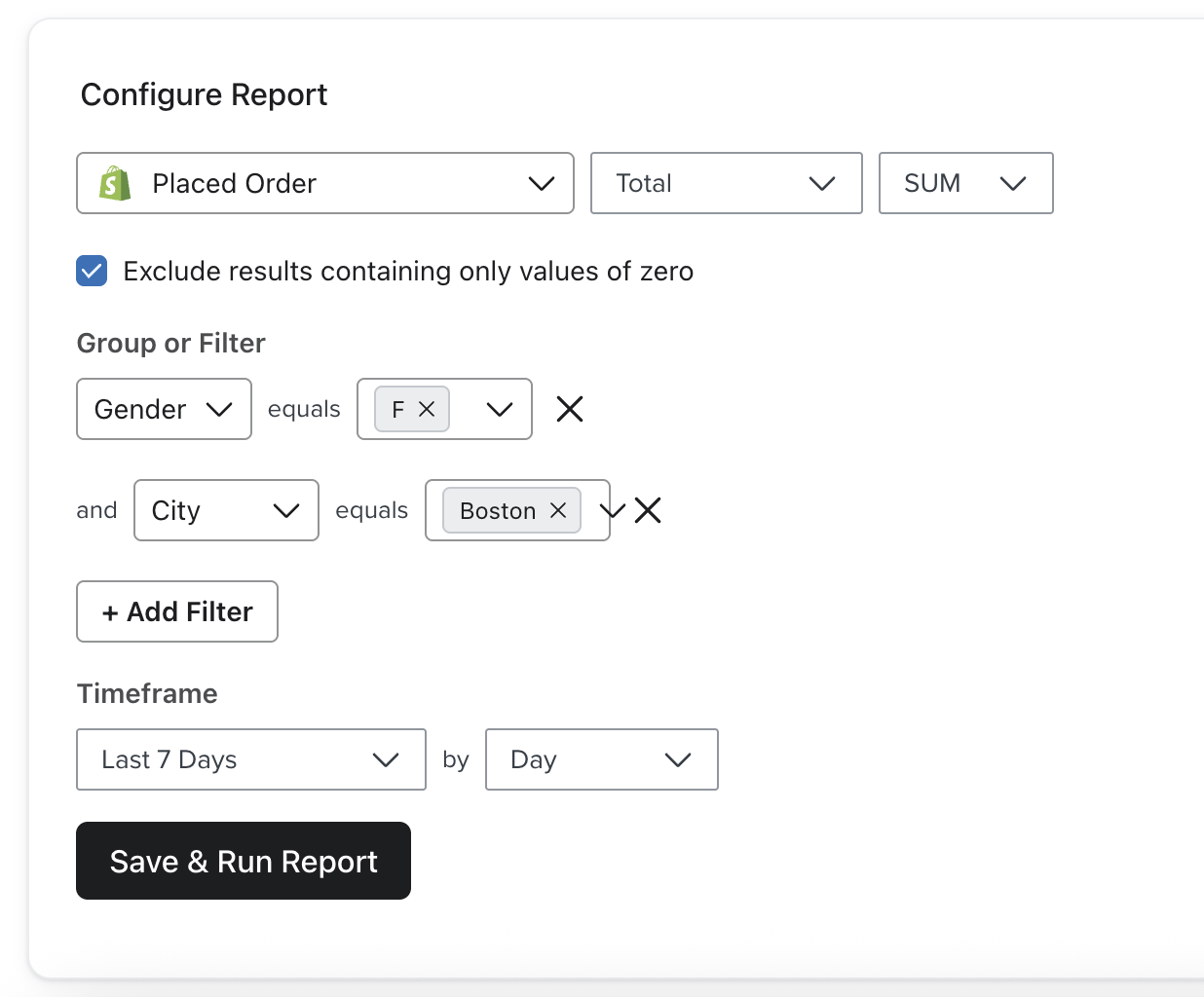 En lugar de agrupar tu informe por atribución específica o propiedades del perfil, puedes optar por limitar tus resultados filtrando qué datos se incluyen. Por ejemplo, si sólo quieres informar sobre el rendimiento de un sexo concreto, selecciona + Añadir filtro para configurarlo.Si desea ser más exclusivo y limitar la búsqueda a actividades que cumplan varios criterios diferentes, puede añadir filtros adicionales. Todos ellos aparecerán separados por el conector AND. En este momento, no es posible informar sobre una sección transversal de filtros separados por el conector OR. Por ejemplo, puede generar un informe sobre todos los pedidos realizados por personas cuyo género sea «Femenino» Y cuya ciudad sea «Boston». Sin embargo, no puede ver la actividad solo de aquellas personas cuyo Género sea Femenino O cuyo País sea Boston. Esto también es válido para los datos de eventos enviados en una matriz como Collections.