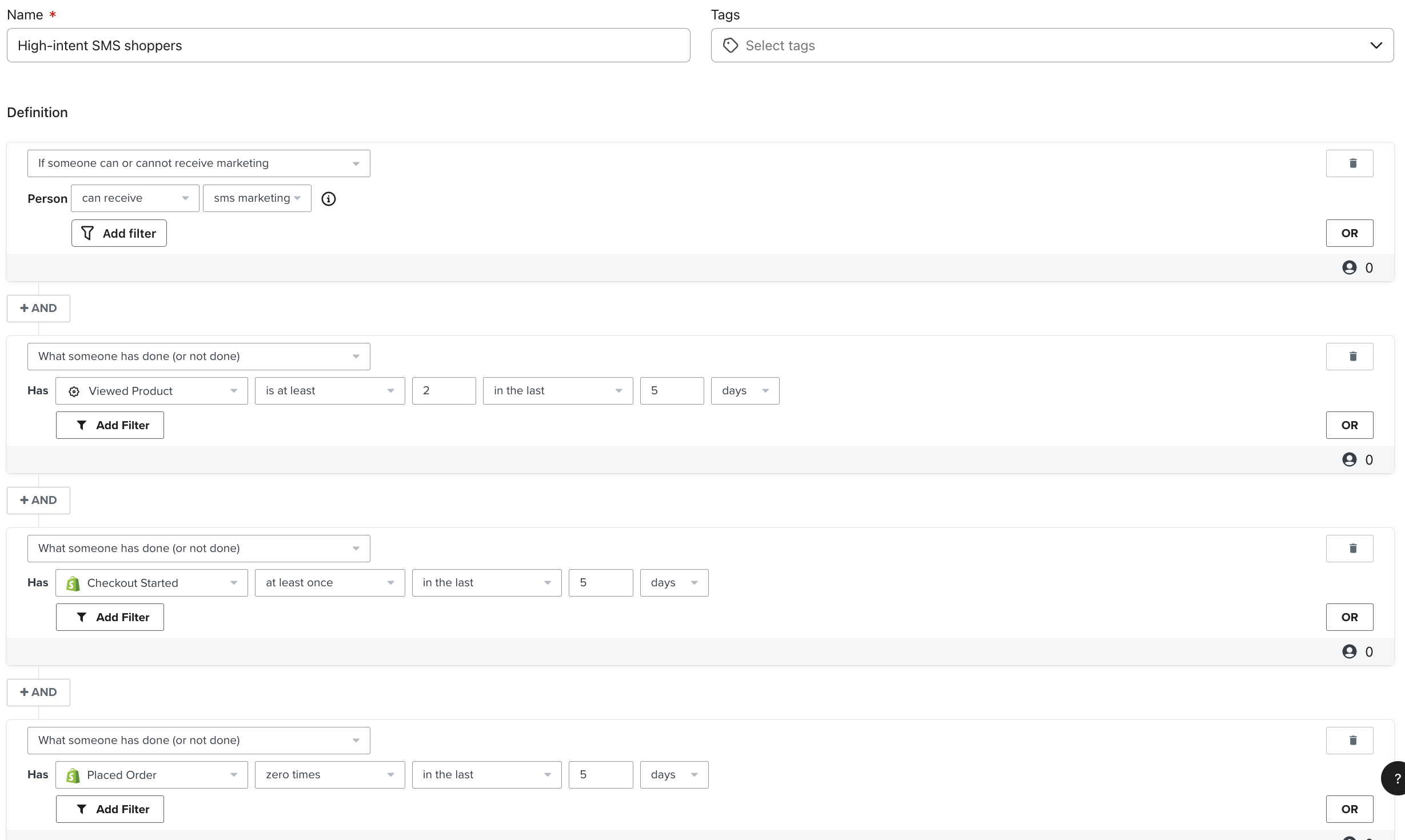 También recomendamos añadir una condición que diga que alguien optó por el SMS hace más de 30 días, para evitar enviar mensajes a quienes están en tu flujo de bienvenida.