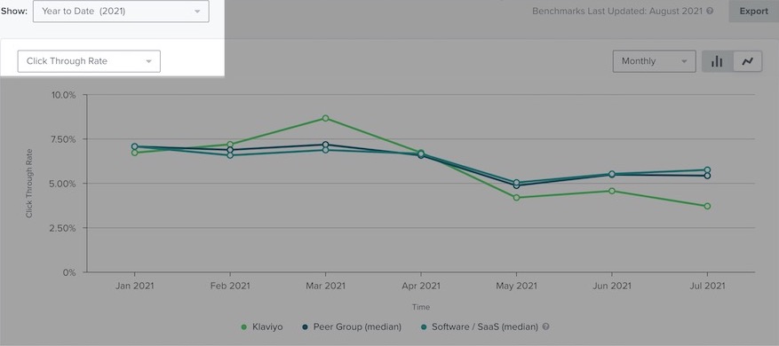 Ten en cuenta que Klaviyo métricas de referencia cuenta actualmente con datos de correo electrónico y no incluye datos de SMS.