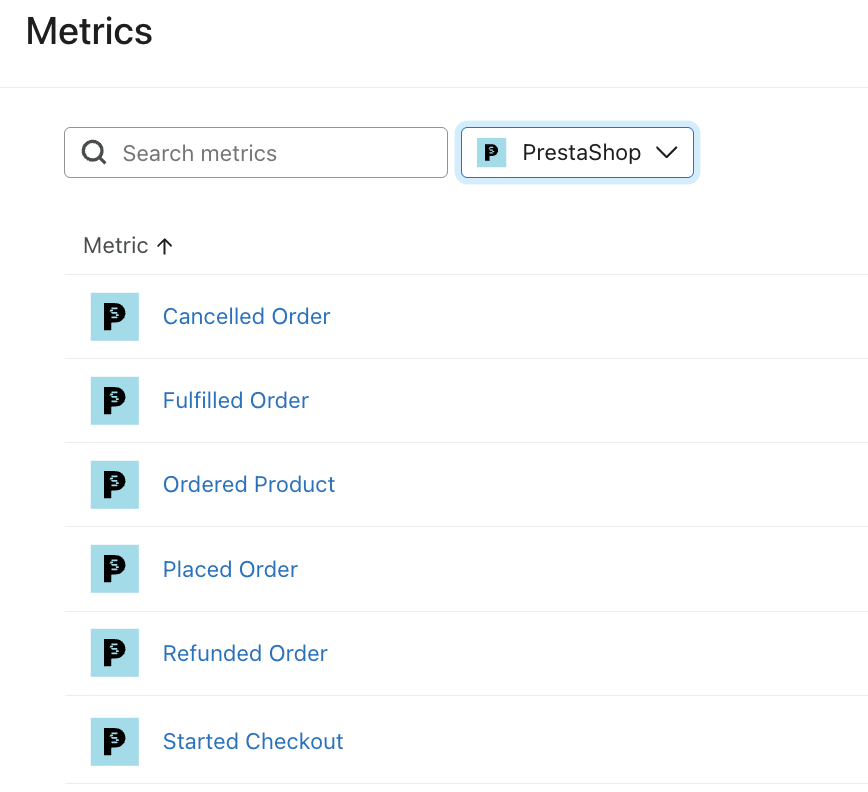 Puedes ver todas las métricas de PrestaShop en Klaviyo accediendo a Análisis > Métricas. Filtra por PrestaShop para ver los eventos de pedidos y pedidos transaccionales (tendrán un ícono PrestaShop ) o filtra por API para ver los eventos en el sitio de Klaviyo (tendrán un ícono de engranaje).