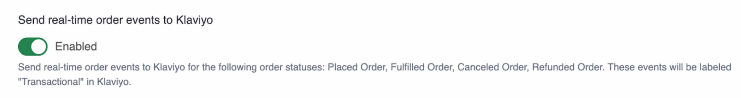 Si activaste la opción Enviar eventos de pedido en tiempo real a Klaviyo al realizar la integración, un segundo conjunto de eventos de pedido etiquetados como transaccionales se sincronizará con Klaviyo en tiempo real. Por ejemplo, verás una métrica en Klaviyo con la etiqueta Transacción de Pedido Realizado, que se sincronizará en tiempo real, además de una métrica con la etiqueta Pedido Realizado, que se sincronizará cada 30 minutos. Los eventos transaccionales en tiempo real que se sincronizan con Klaviyo son: