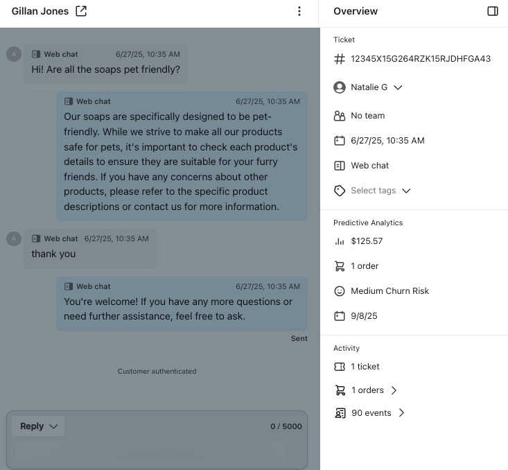 - Los agentes pueden editar y cancelar pedidos de Shopify, directamente desde el tiquete. También pueden omitir, cancelar o editar las subscripciones de recarga.