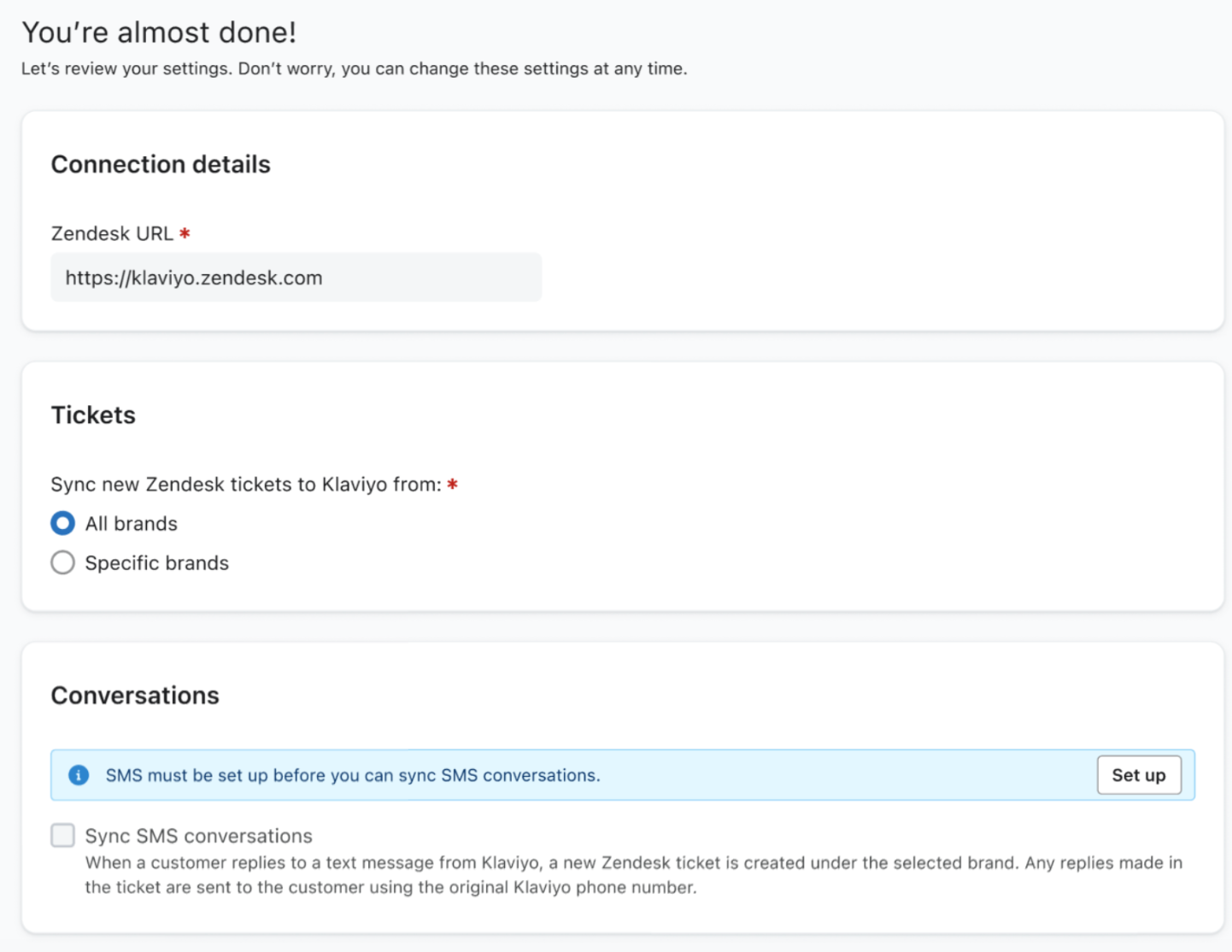 El 23 de abril de 2025, Klaviyo lanzó OAuth para Zendesk y equipo de asistencia para Zendesk cuenta multimarca. Conectar Zendesk y Klaviyo mediante OAuth proporciona una experiencia de autenticación más segura. Ahora puedes sincronizar tickets de marcas de Zendesk específicas con Klaviyo, y crear tickets en Zendesk a partir de mensajes SMS entrantes de una marca de Zendesk específica.
