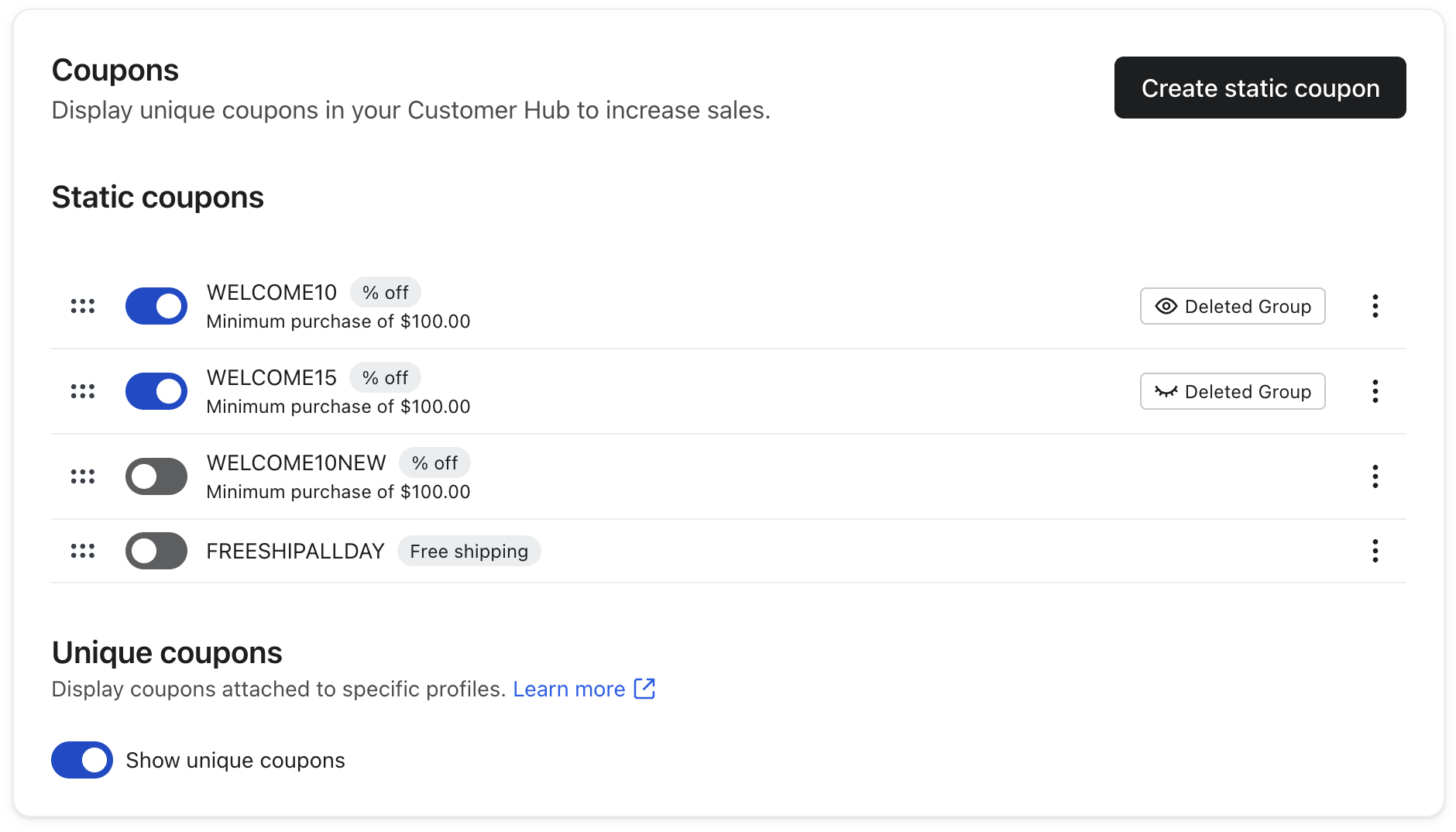 Consejo: para evitar que aparezca ningún cupón en Klaviyo Customer Hub, desactiva/inhabilita cupón único y desactiva o elimina cualquier cupón estático que hayas añadido.