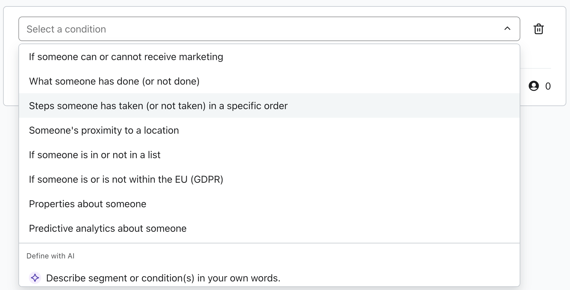 - En el menú desplegable de condiciones, selecciona Pasos que alguien ha dado (o no ha dado) en un orden específico.