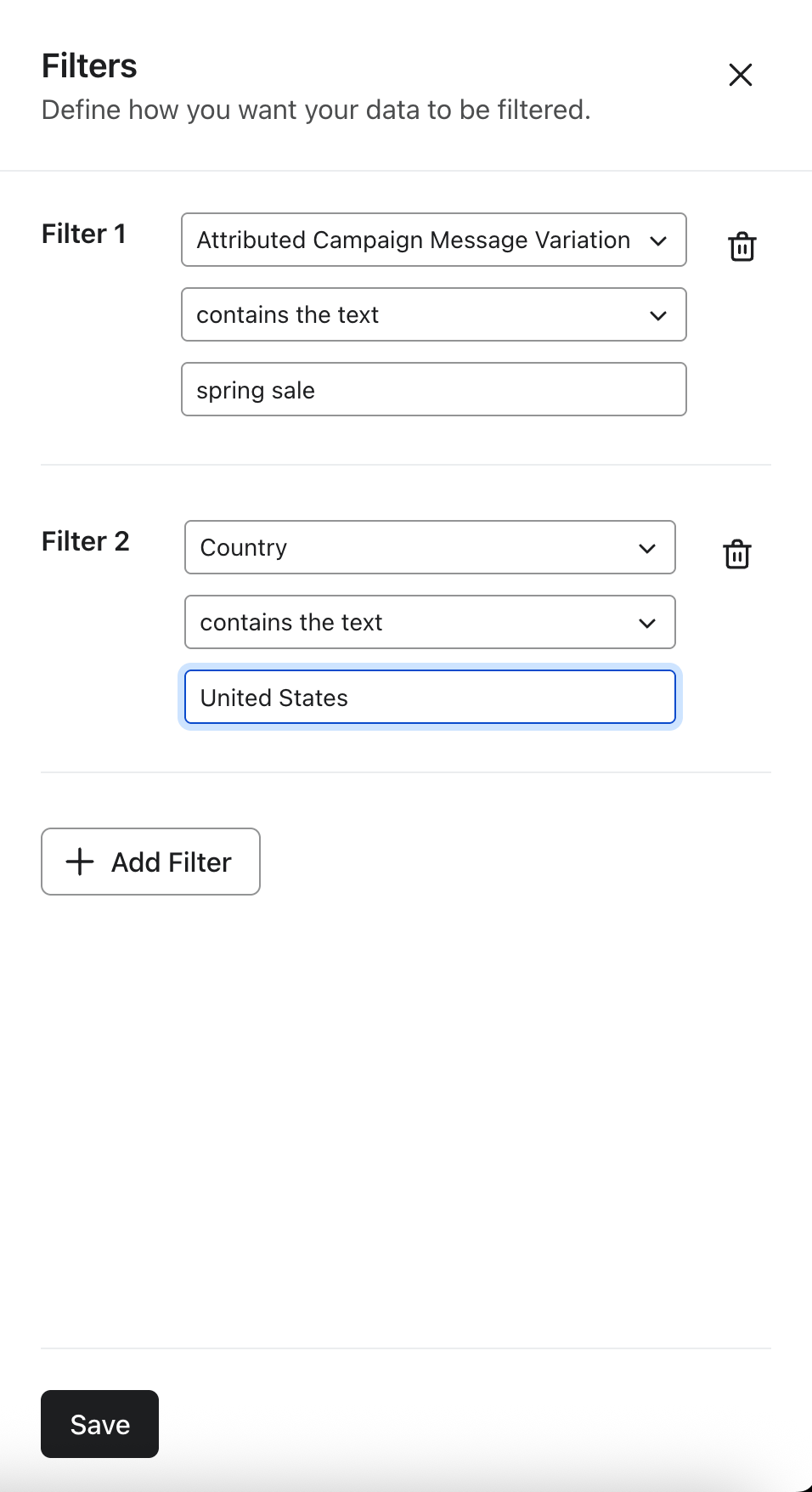 - Puedes agregar agrupaciones adicionales seleccionando atributos como el nombre de la campaña, el canal, el formato del mensaje de texto (por ejemplo, SMS, MMS, RCS), variante de prueba A/B, proveedor de bandeja de entrada, país, recencia actual, frecuencia, gasto (RFM) y más. Una vez que exportes tus datos a CSV, podrás utilizar estas agrupaciones para pivotar tus datos y crear vistas anidadas únicas.