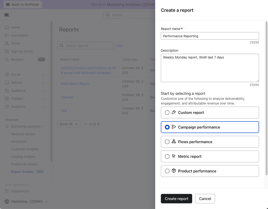 - Ve a Avanzado → Klaviyo Marketing Analytics → Creador de informes (Beta).