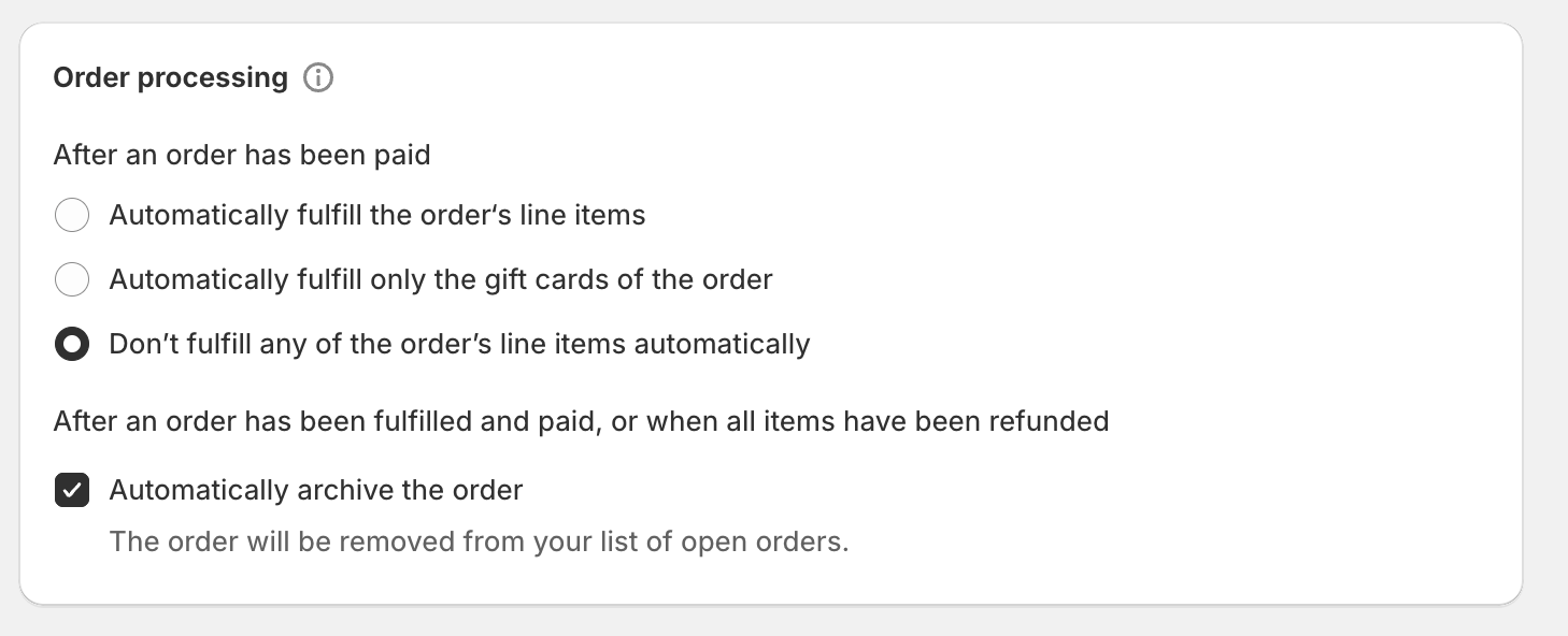 3. Asegúrate de que está seleccionada la opción No cumplimentar automáticamente ninguna de las partidas del pedido. Esto garantiza que un evento de cumplimiento no se sincronizará con Klaviyo (y potencialmente activará un correo electrónico) justo cuando se pague el pedido.