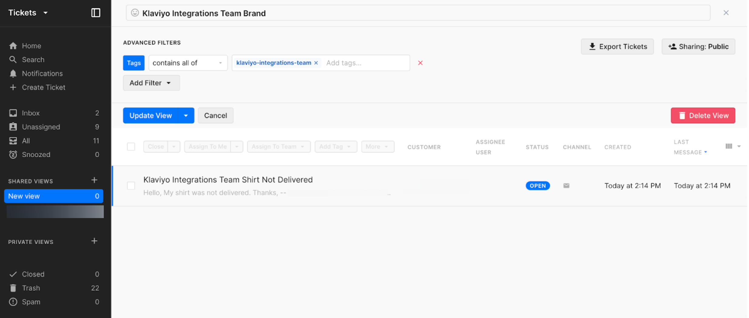 Una vez configuradas las integraciones, Klaviyo creará automáticamente un nuevo ticket cada vez que alguien envíe una reseña que cumpla los criterios que hayas establecido (es decir, que tenga una valoración de estrellas igual o inferior a tu selección).