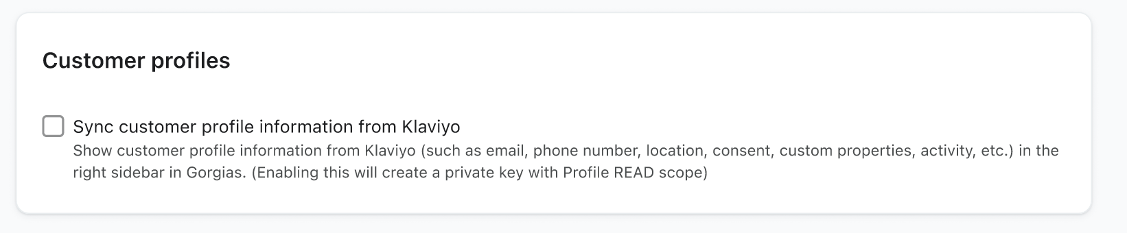 - RECOMENDADO: Comprueba Sincronizar información del perfil del cliente desde Klaviyo a Gorgias para enviar direcciones de correo electrónico de contacto, números de teléfono, propiedades del perfil y más a Gorgias. Estos datos sólo se sincronizarán si tienes activados los SMS o las revisiones.