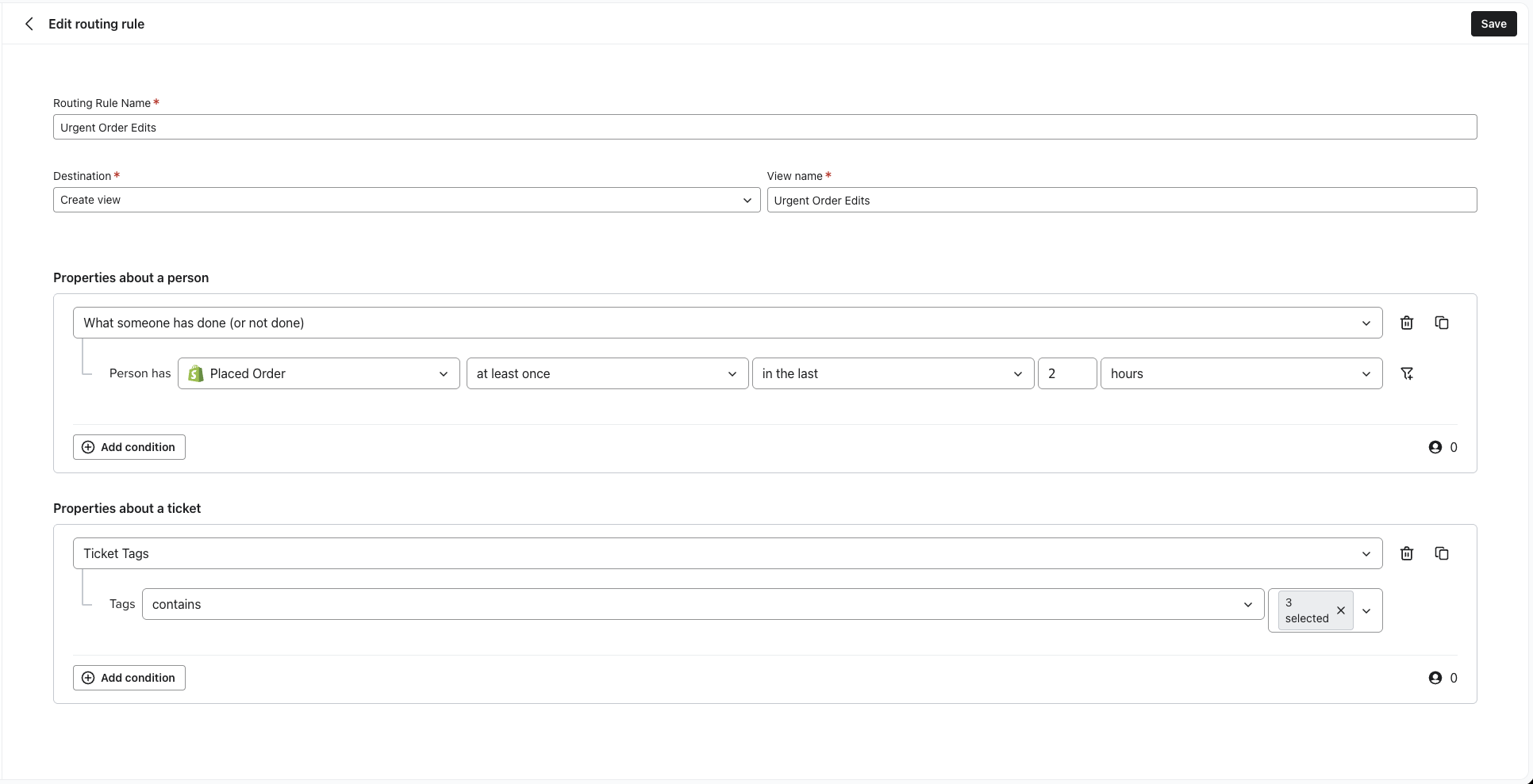 Las reglas de enrutamiento avanzadas te permiten distribuir automáticamente los tickets entrantes al equipo o vista adecuados en función de todos los datos de los clientes que ya tienes en Klaviyo.