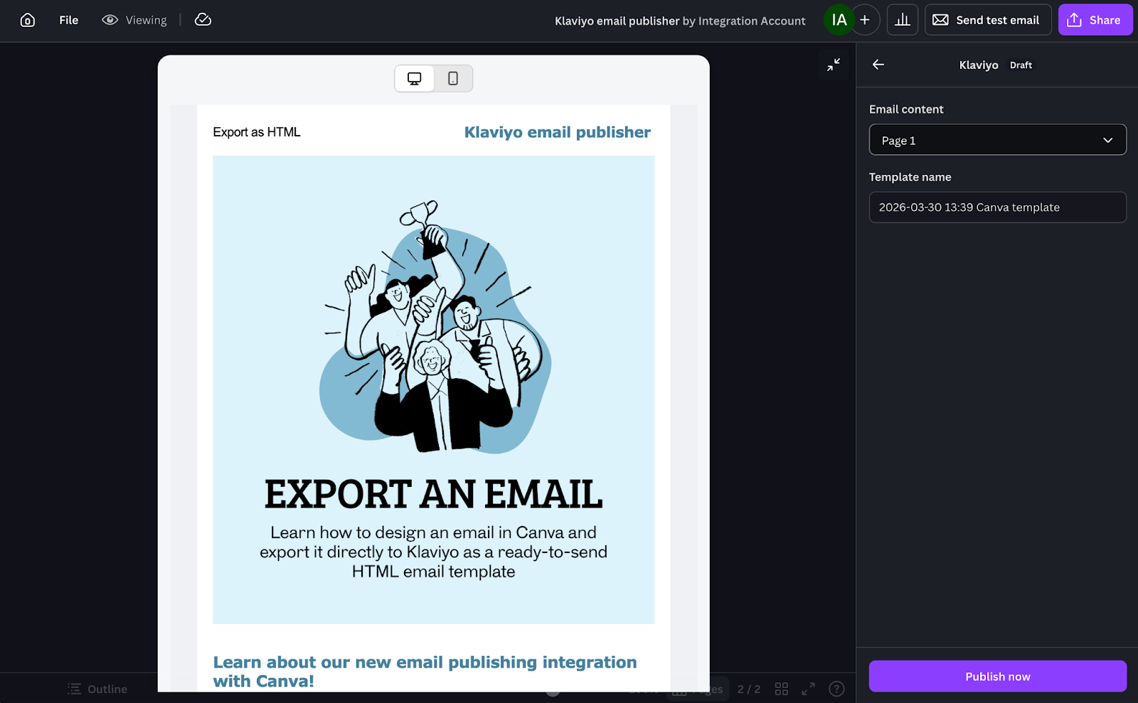 - Haz clic en Publicar ahora. Canva preparará tu diseño como plantilla de correo electrónico HTML y lo enviará a Klaviyo.