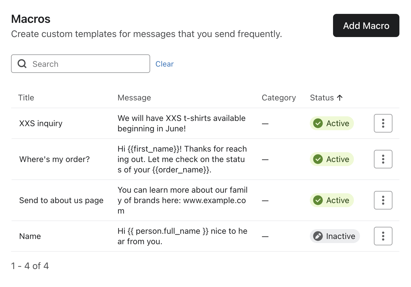 Todas las macros que crees están tienda, comercio en la página de configuración de Macros. Ten en cuenta que las macros con personalización de orden y perfil aparecen como etiqueta de plantilla en esta página. Sin embargo, cuando se utilicen en una respuesta a un ticket, estas etiquetas se sustituirán por los datos de clientes pertinentes.
