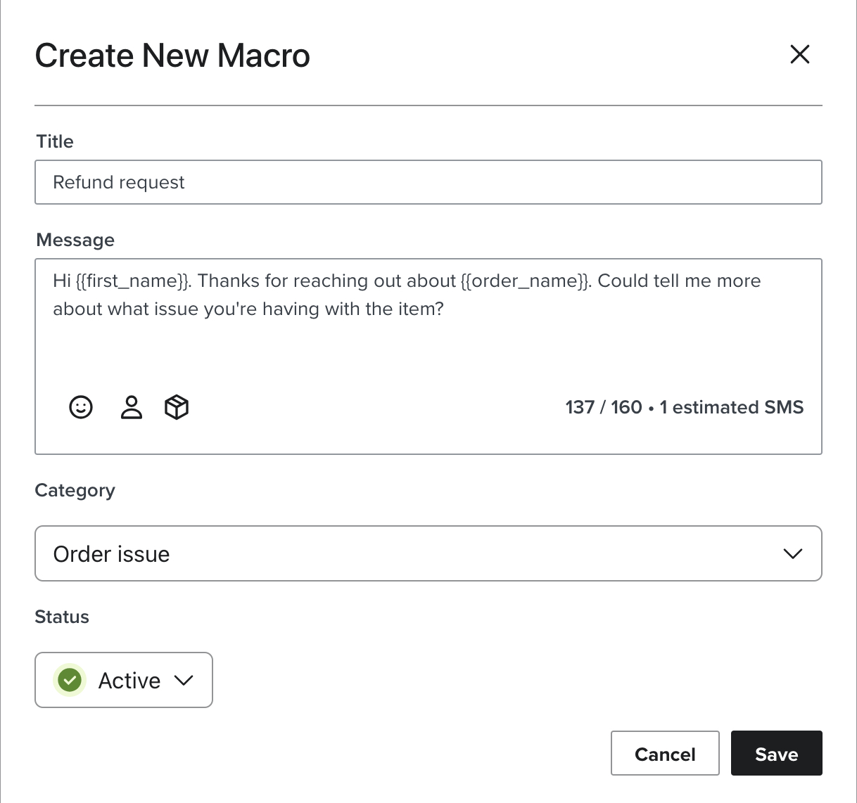 Descubre cómo crear y emplear macros (antes llamadas "respuesta rápida") en los tiquetes en Klaviyo Helpdesk. Las macros son respuestas preescritas y reutilizables que tus agentes del equipo de asistencia pueden insertar en las respuestas de los tiquetes de SMS y del chat sitio web.