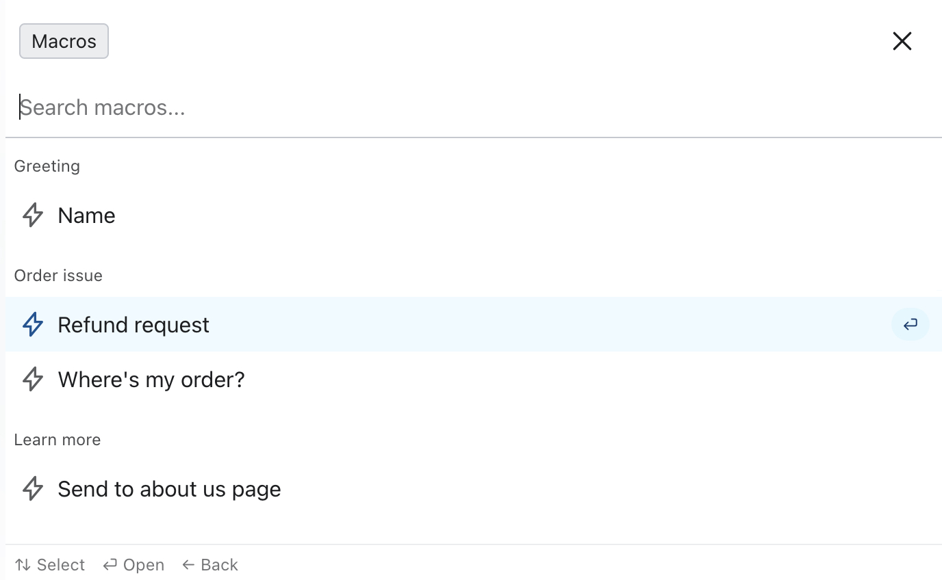 Puedes crear macros diferentes para distintos tipos de solicitudes de equipo de asistencia (por ejemplo, tiempo de envío, política de devoluciones o estado del pedido), y organizarlas por categorías. Esto facilita que tu equipo de asistencia encuentre e inserte rápidamente la respuesta adecuada para cada ticket de cliente.