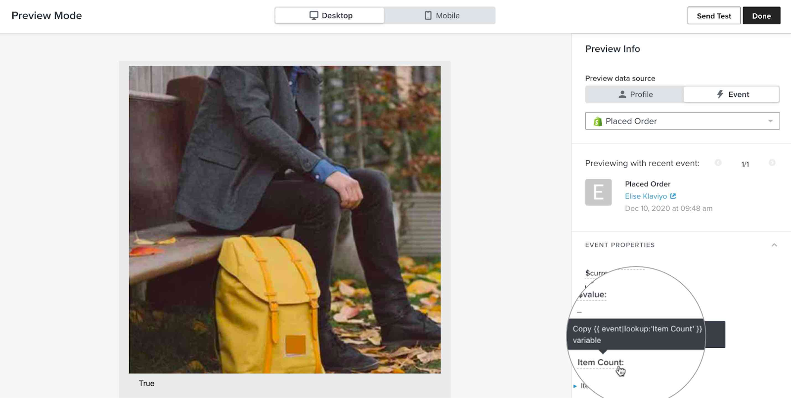 En la captura de pantalla siguiente, verás la etiqueta {{ event|lookup:'Item Count' }}. Sólo necesitarás el texto event|lookup:'Recuento de elementos' para tu condición mostrar/ocultar. Ten en cuenta que tus datos pueden utilizar una estructura diferente, como {{ event.extra.line_items.0.title }} o {{ event.ShippingAddress.address1 }}. Utiliza la variable tal y como aparece en los datos de tu evento.