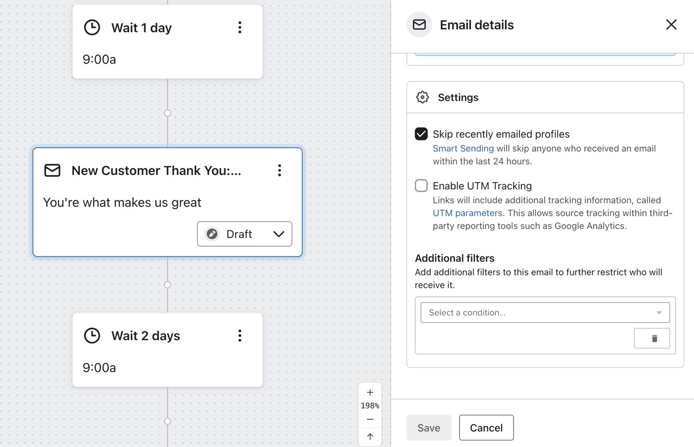 Au fur et à mesure que vous ajoutez des actions à ce flux, vous pouvez souhaiter n’envoyer certains messages qu’aux personnes qui n’ont pas ouvert le précédent. C’est un excellent moyen de renvoyer une offre intéressante ou de recycler partiellement un bon design jusqu’à ce que vous attiriez l’attention de vos clients.