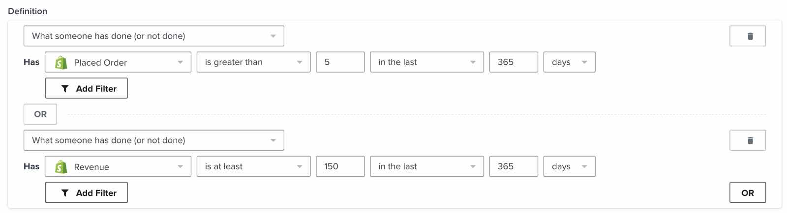 Notez que vous ne verrez pas les revenus apparaître comme une option dans le créateur de segments si personne n'a passé de commande dans votre magasin. Cela peut se produire si vous ouvrez un nouveau magasin et que vous commencez à utiliser Klaviyo.