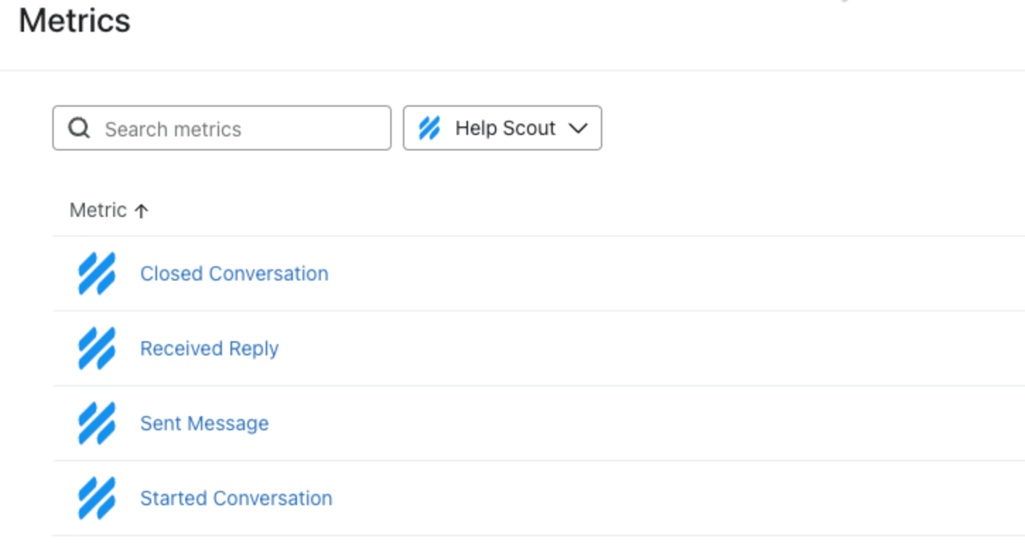 Pour voir les métriques de Help Scout synchronisées dans votre compte Klaviyo, cliquez sur le menu déroulant Analytics dans Klaviyo, puis sélectionnez l'onglet Metrics . Sélectionnez Help Scout dans le menu déroulant pour afficher tous les événements associés.
