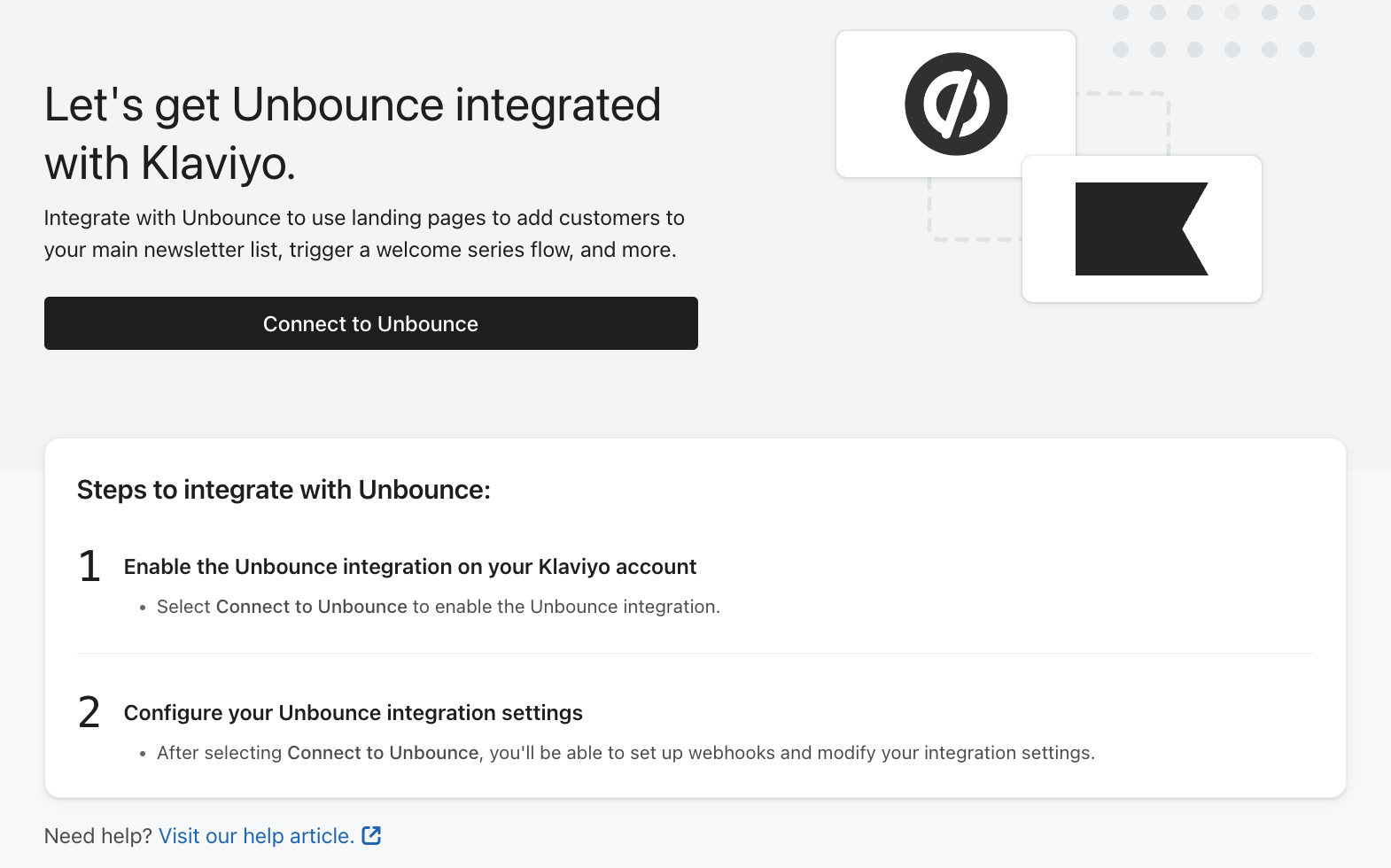 Apprenez à intégrer Unbounce avec Klaviyo afin de vous aider à utiliser la page d'atterrissage pour ajouter un client à votre liste principale d'e-mails, déclencher une série de flux de bienvenue, et plus encore. Vous pouvez collecter contact via un Unbounce landing page et ensuite envoyer automatiquement une série de bienvenue et d'autres messages personnalisés. L'activation de l'intégration de Klaviyo à Unbounce nécessite des étapes à l'intérieur de Klaviyo et de Unbounce.
