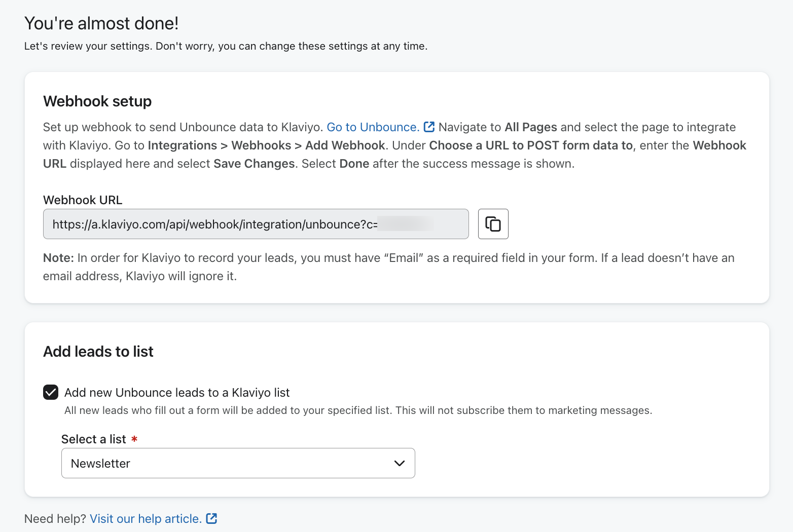 - Copiez l'URL du Webhook sous Configuration du Webhook. Cette URL sera utilisée dans la section suivante pour créer un webhook vers Klaviyo dans Unbounce.