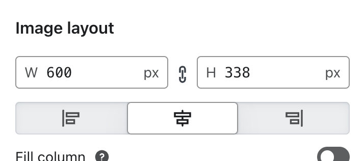 2. Ajoutez un numéro au champ Image mise en page > W. Pour les images de pleine largeur, utilisez 600 px (ou la largeur définie pour votre e-mail dans la section Styles ).