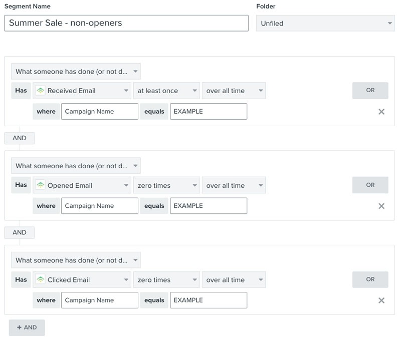 Pour vous aider à éliminer les ouvertures de MPP de vos données, incluez toujours des filtres d'ouverture et de clics, comme le montre l'exemple de segment ci-dessous. Cela vous permet de capturer tous les utilisateurs qui ont été suivis comme ayant cliqué sur le message mais ne l'ayant pas ouvert. Vous pouvez également ajuster vos paramètres de conversion d'email dans votre compte pour suivre les ouvertures MPP par défaut.