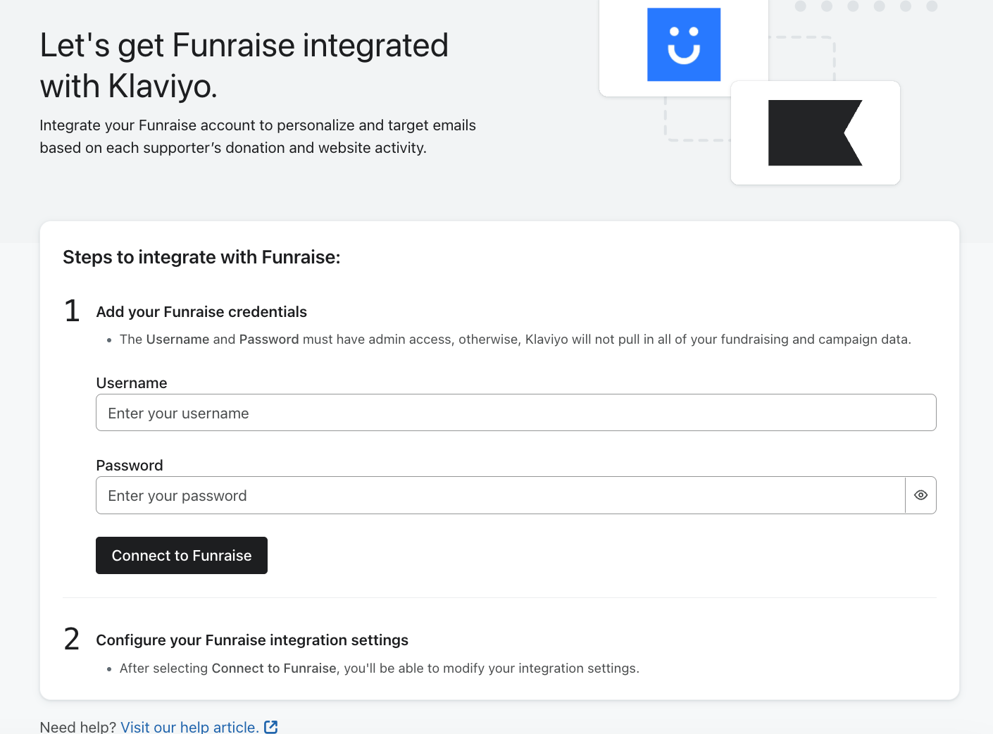 - Saisissez votre nom d'utilisateur et votre mot de passe, puis cliquez sur Connexion à Funraise. Notez que l'email et le mot de passe doivent avoir un accès administrateur, sinon Klaviyo ne pourra pas récupérer toutes vos données de collecte de fonds et de campagne.