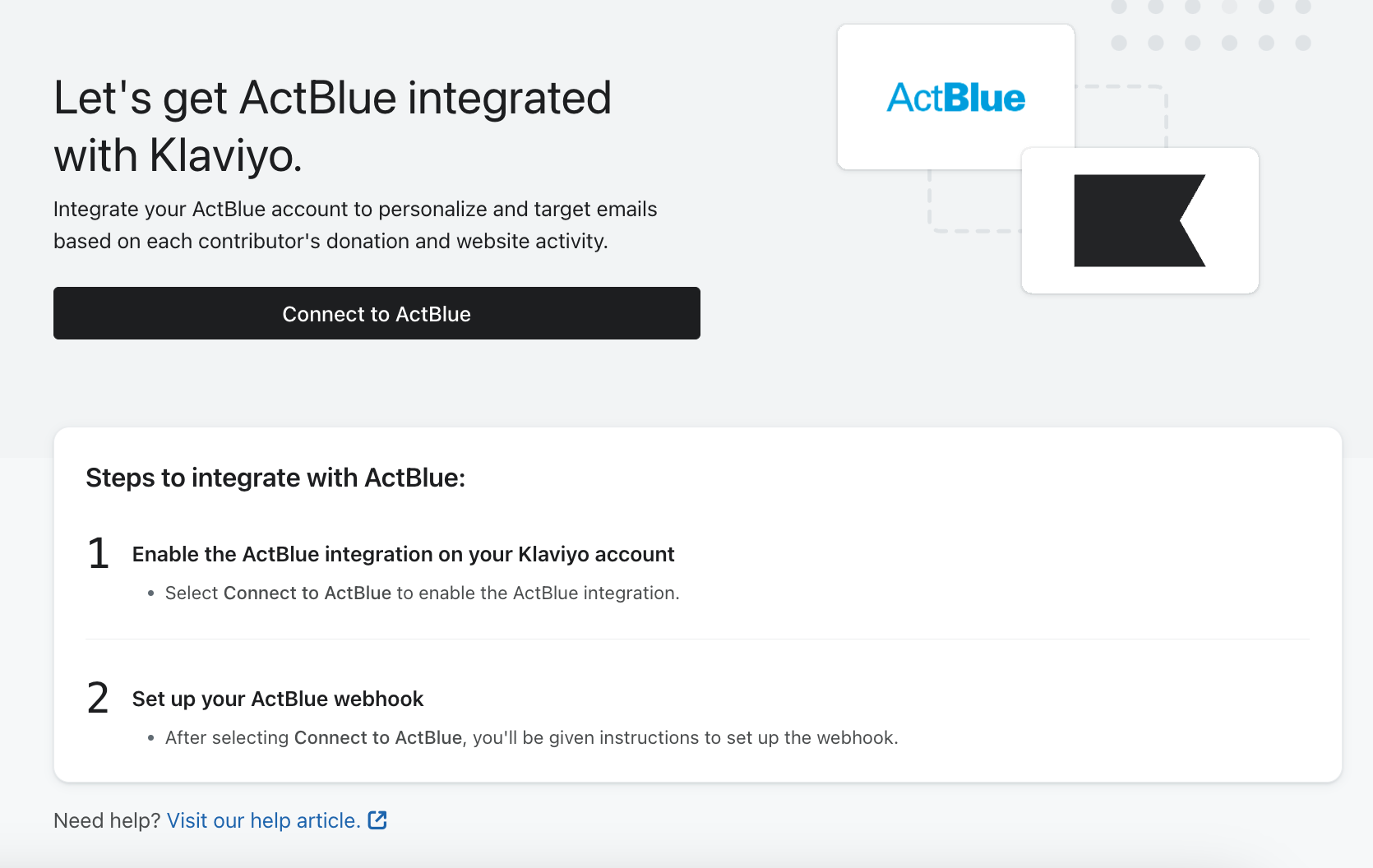 Découvrez comment intégrer ActBlue à Klaviyo. Une fois ces étapes franchies, vous serez en mesure de personnaliser et de cibler les e-mails en fonction des dons et de l'activité du site Web de chaque contributeur. Voici quelques-unes des données que nous synchronisons avec ActBlue :