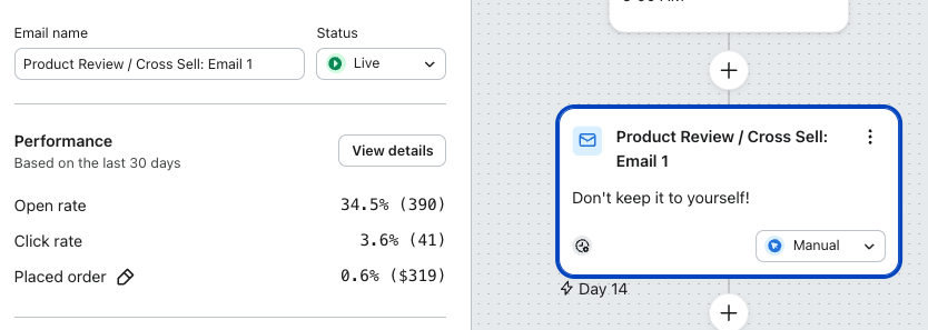 Lorsque vous changez de plateforme d’e-commerce, veillez à remplacer les indicateurs utilisés pour vos flux et analyses par ceux de votre nouvel outil. Par exemple, si vous passez de BigCommerce à Shopify, il est possible que les analyses et flux de votre compte soient encore configurés pour utiliser l’indicateur Placed Order de BigCommerce plutôt que celui de Shopify. Pour en savoir plus, consultez notre guide sur la modification d’un déclencheur de flux.