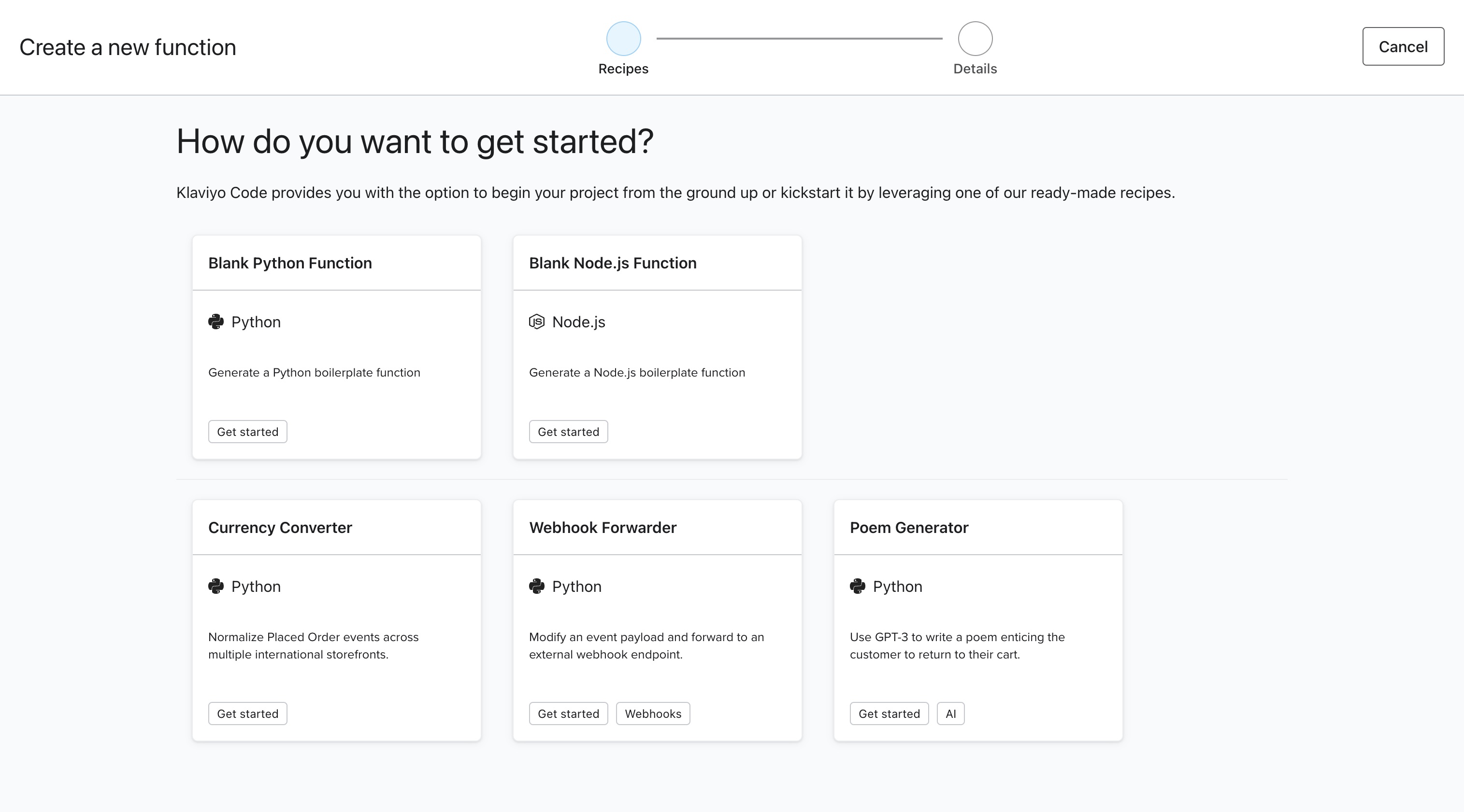 Vous accédez à la page Recettes, qui vous permet de sélectionner une solution préconçue à exécuter, ou une fonction Python ou Node.js vierge.