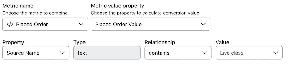 Comme le montre l'exemple ci-dessous, en utilisant Source name et contains, vous pouvez inclure toutes les classes en direct dans votre mesure personnalisée Placed Order. De cette manière, vous capturez tous les revenus provenant de votre site web et des cours qui se déroulent en personne ou qui sont achetés par l'intermédiaire d'une autre plateforme.