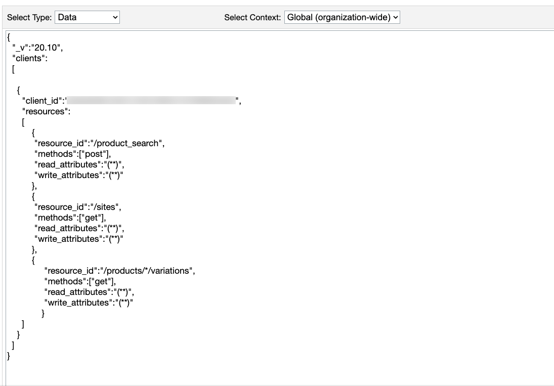 Une fois ajoutés, les paramètres devraient ressembler à ceci :{ "resource_id":"/products/*/variations", "methods":["get"], "read_attributes":"(**)", "write_attributes":"(**)" } - Cliquez sur Enregistrer.