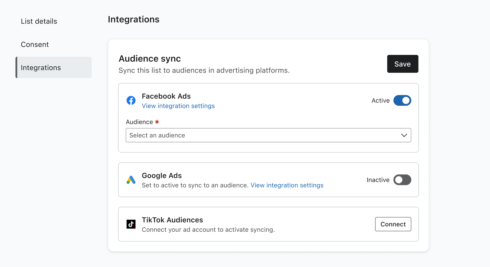 - Vous accédez alors à l’onglet Intégrations de la page Paramètres de la liste ou du segment.